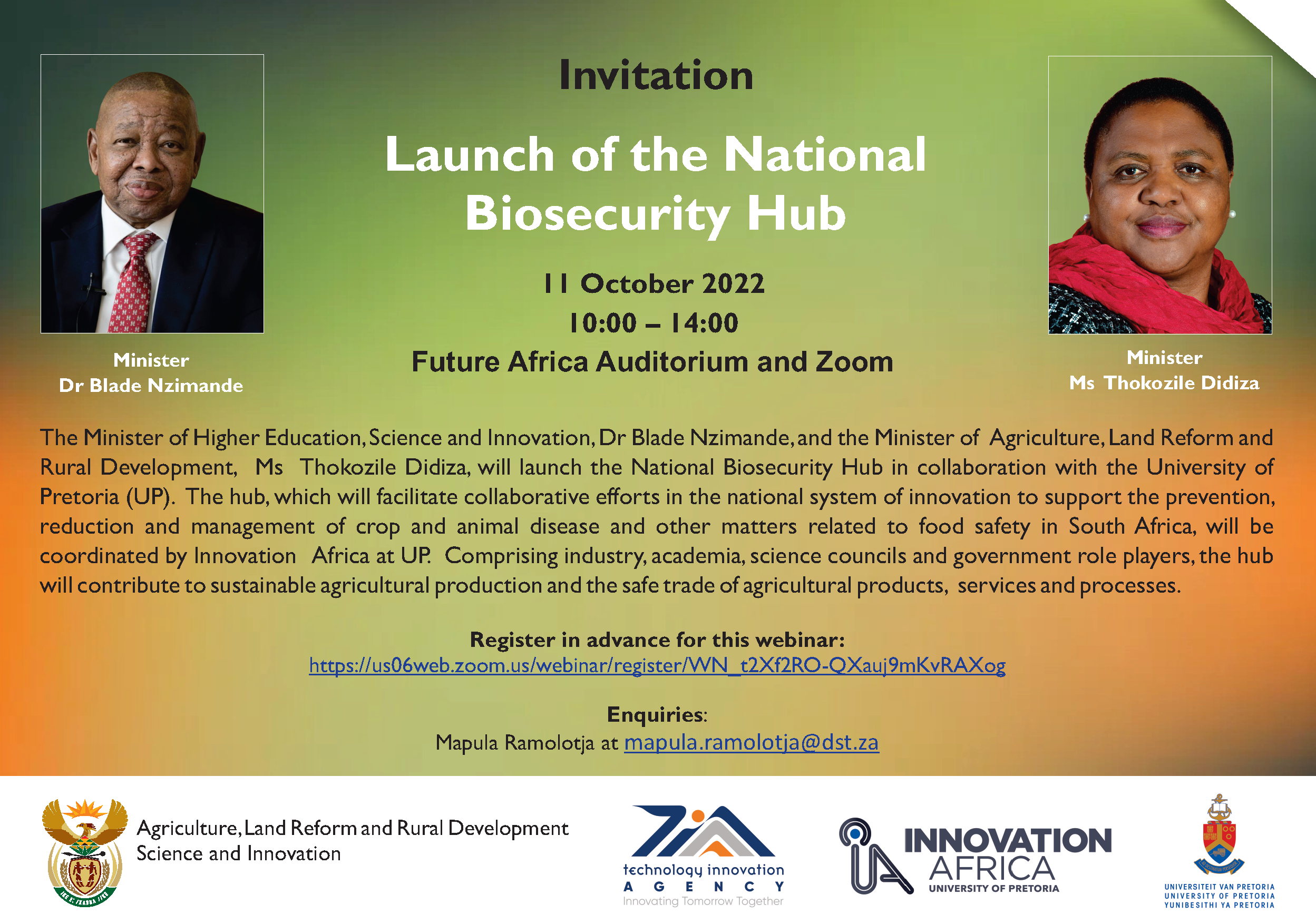 The Minister of Higher Education, Science and Innovation, Dr Blade Nzimande, and the Minister of Agriculture, Land Reform and Rural Development, Ms Thokozile Didiza, will launch the National Biosecurity Hub in collaboration with the University of