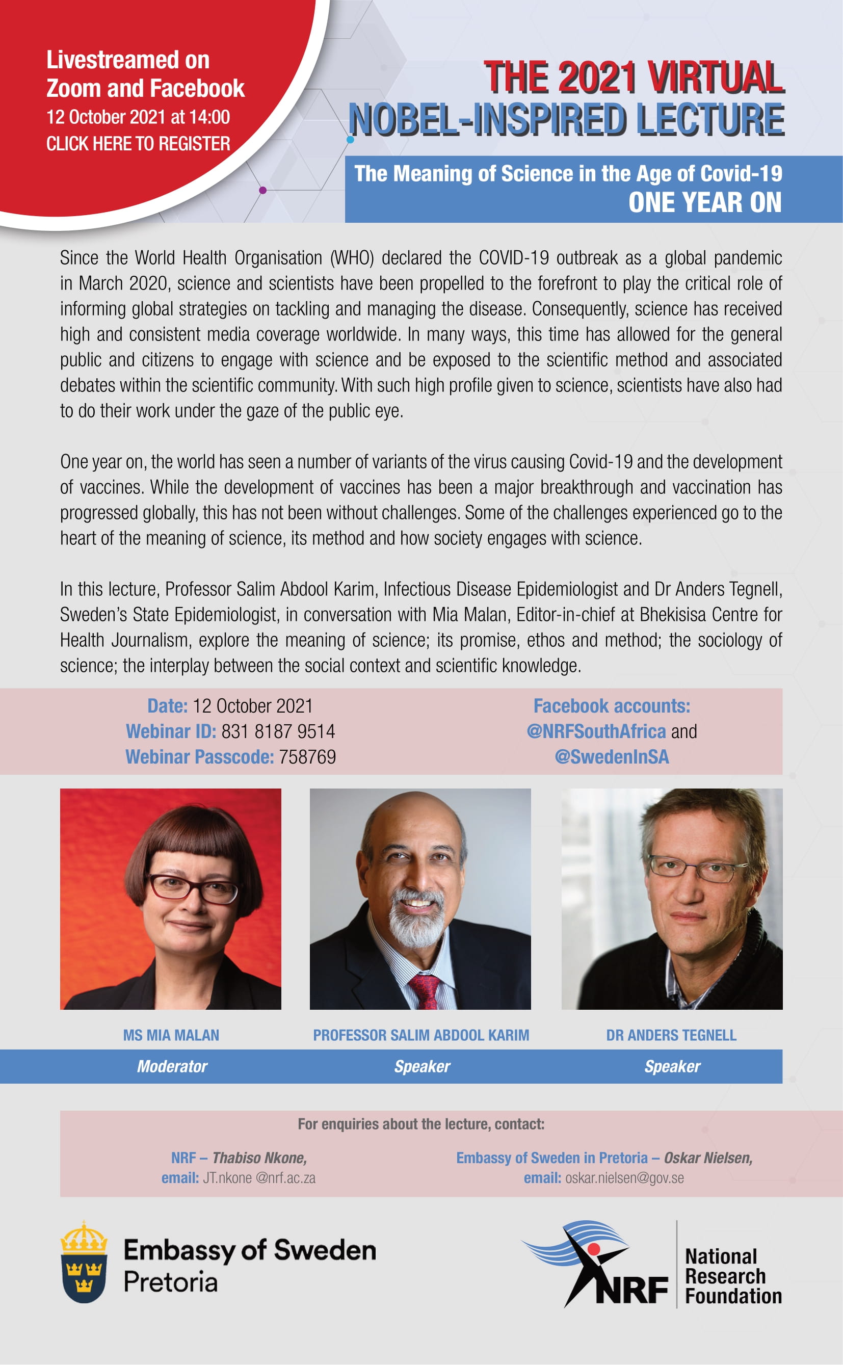 In this lecture, Professor Salim Abdool Karim, Infectious Disease Epidemiologist and Dr Anders Tegnell, Sweden’s State Epidemiologist, in conversation with Mia Malan, Editor-in-chief at Bhekisisa Centre for Health Journalism, explore the meaning of science; its promise, ethos and method; the sociology of science; the interplay between the social context and scientific knowledge.