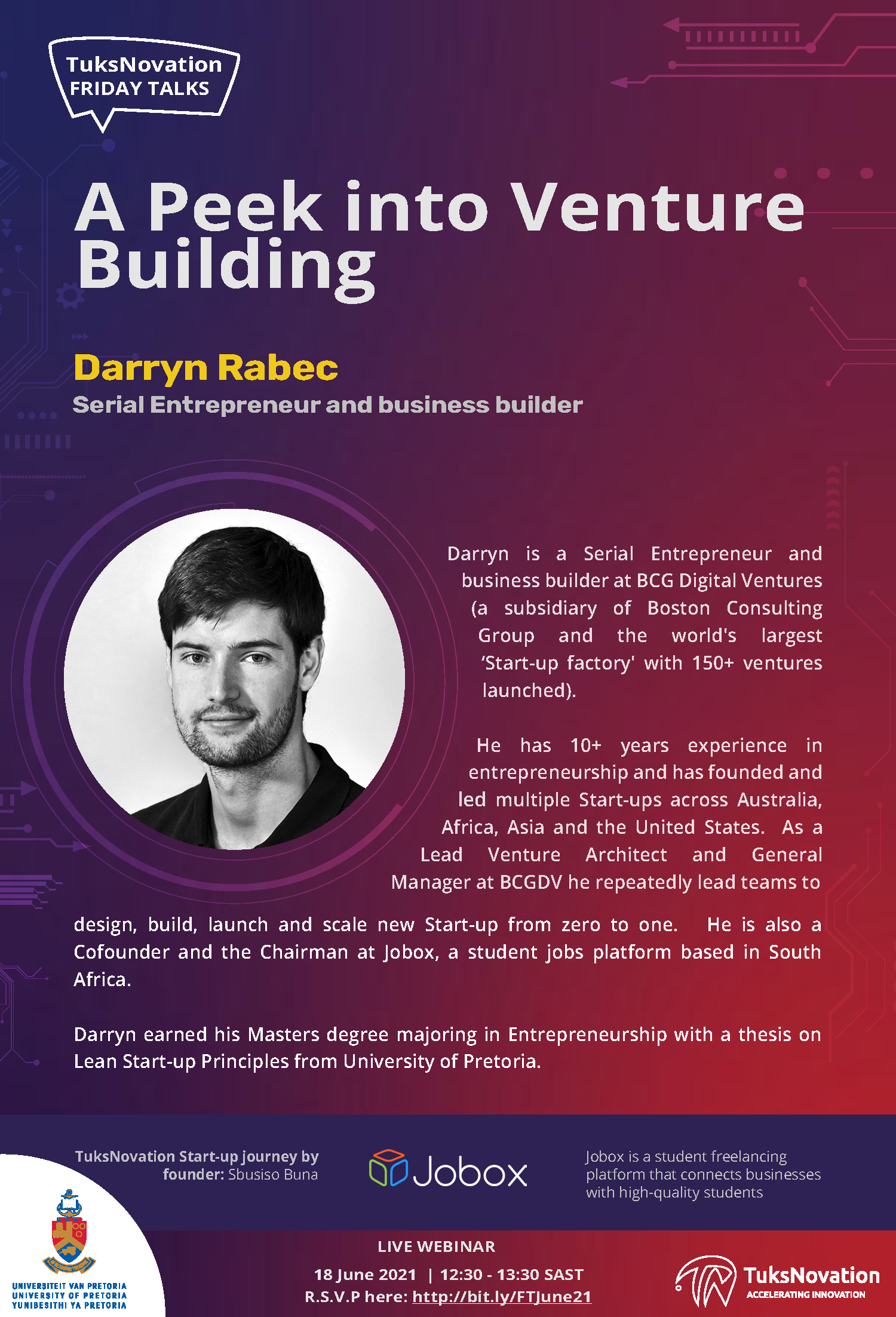 Join TuksNovation as they host their Friday Talks with Darryn Rabec, a serial entrepreneur and venture builder as he gives A Peek into Venture Building.
