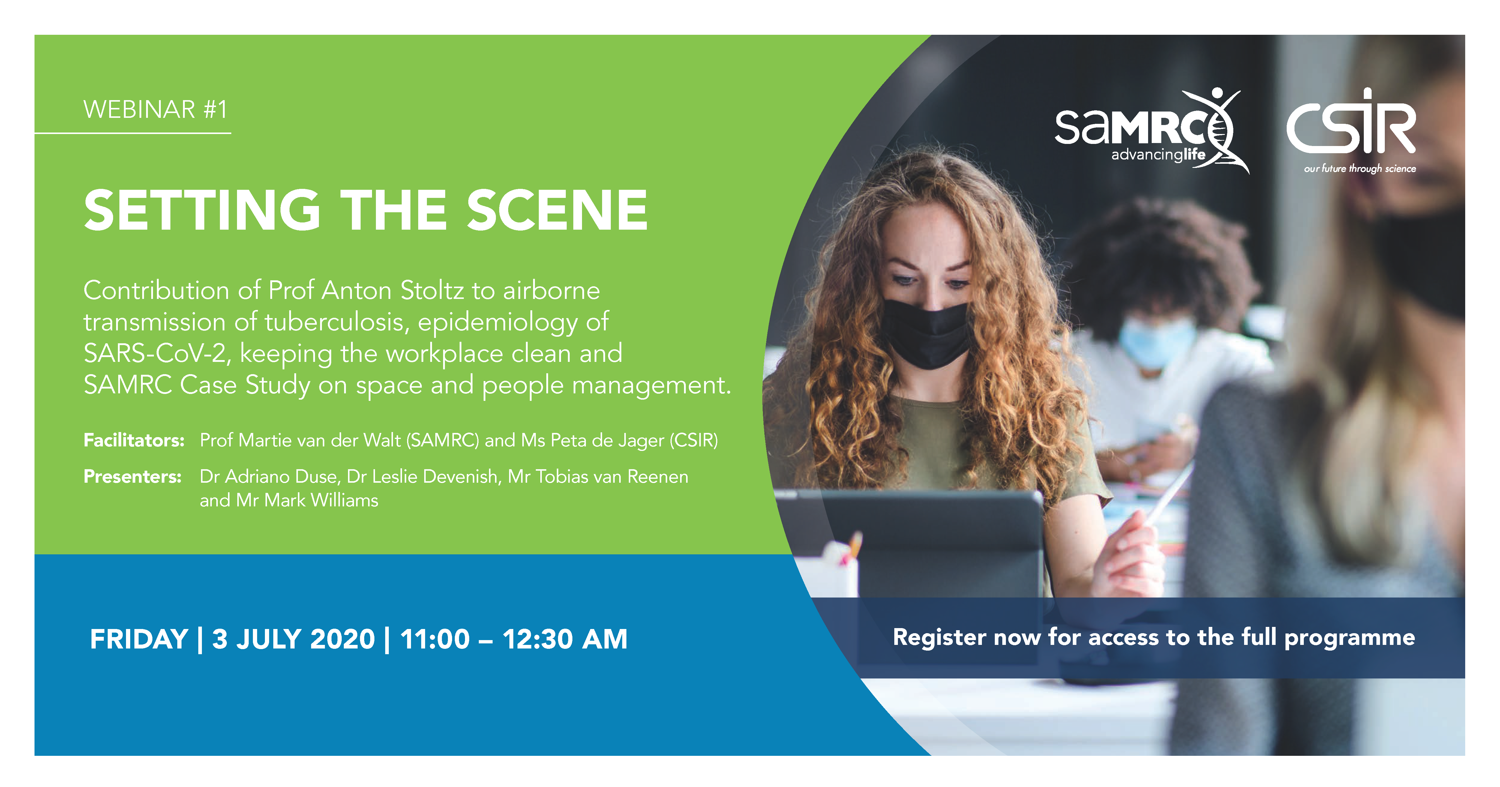 Kindly join the South African Medical Research Council (SAMRC) and The Council for Scientific and Industrial Research (CSIR) for a series of webinars on COVID-19 and the workplace. The webinars focus on the realities and challenges of facilities management and safeguarding employees as South Africans return to work. The hierarchy of infection control measures that consist of administrative, environmental and personal protection measures underwent radical change since the start of the COVID-19 pandemic and best practices in facility management and providing a safe workplace have been found to be inadequate against the protection and spread of the SARS-CoV-2 virus. Understanding the virus and how it is spread is paramount to design effective and efficient standards for facility management and behavioural change among employees.