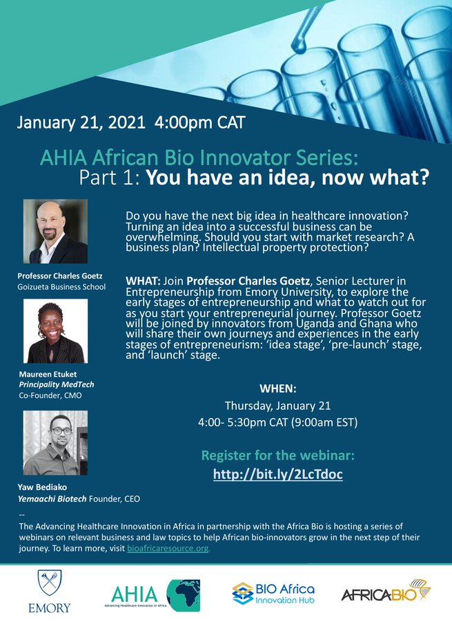 AHIA (Advancing Healthcare Innovation in Africa) is pleased to announce the 2021 African Bio Innovator Webinar Series in collaboration with AfricaBio.