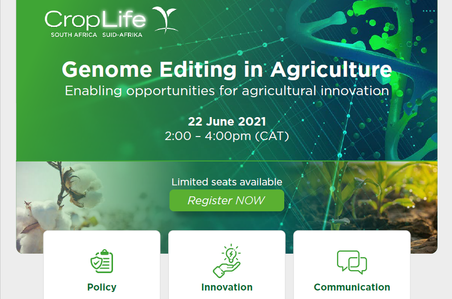 Croplife South Africa will host a webinar that will provide a virtual platform to facilitate dialogue amongst South African stakeholders in the broader agricultural sector by focusing on how an enabling genome editing policy environment could unleash the innovation potential and economic benefits of these technologies for agriculture, as well as farmers.