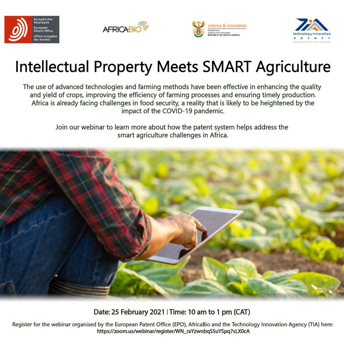 Register and join the Intellectual Property Meets Smart Agriculture webinar brought to you by EPO, AfricaBio and TIA and learn more about how the patent system helps address the smart agriculture challenges in Africa.
