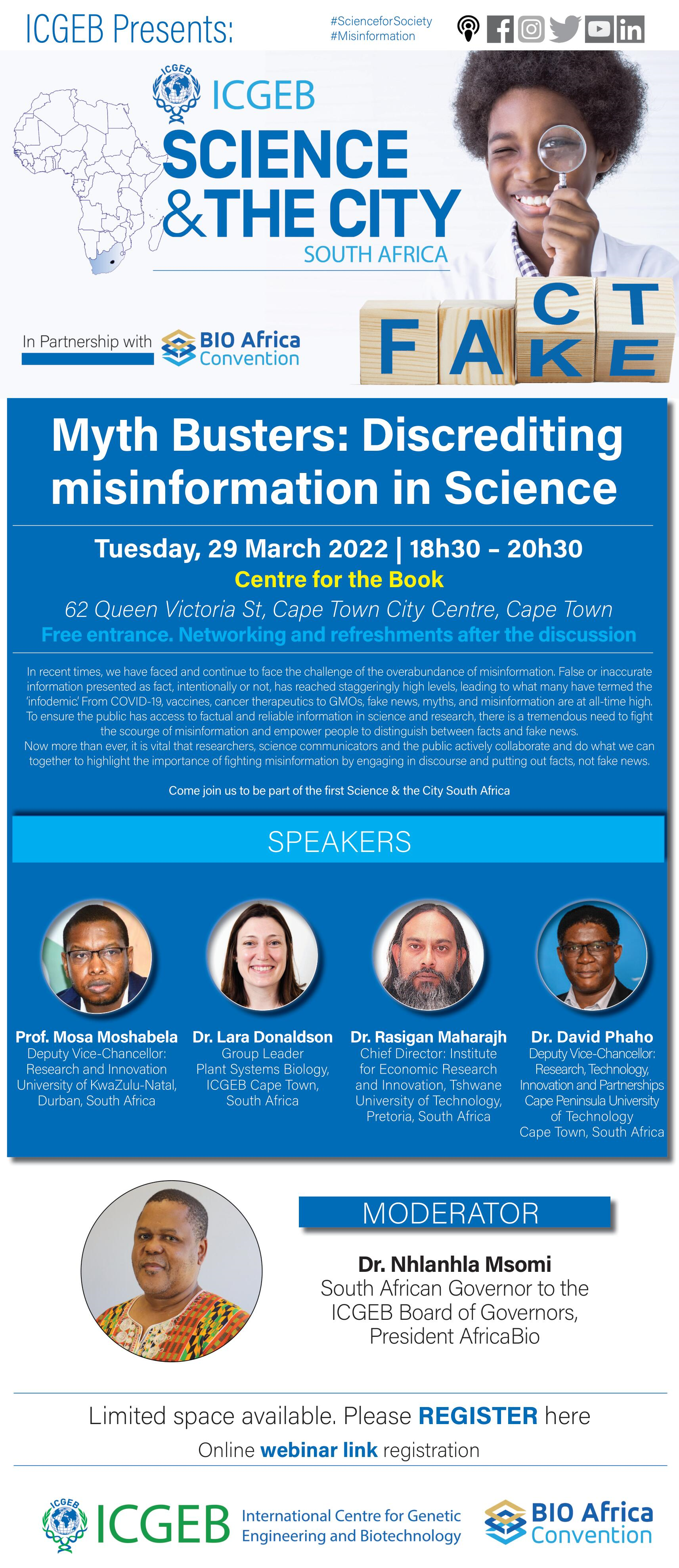 ICGEB is bringing 'Science and the city South Africa' with their 'Myth Busters: Discrediting #misinformation in Science’ event in Cape Town on 29 March 2022. You have an option to attend the venue physically or watch virtually.