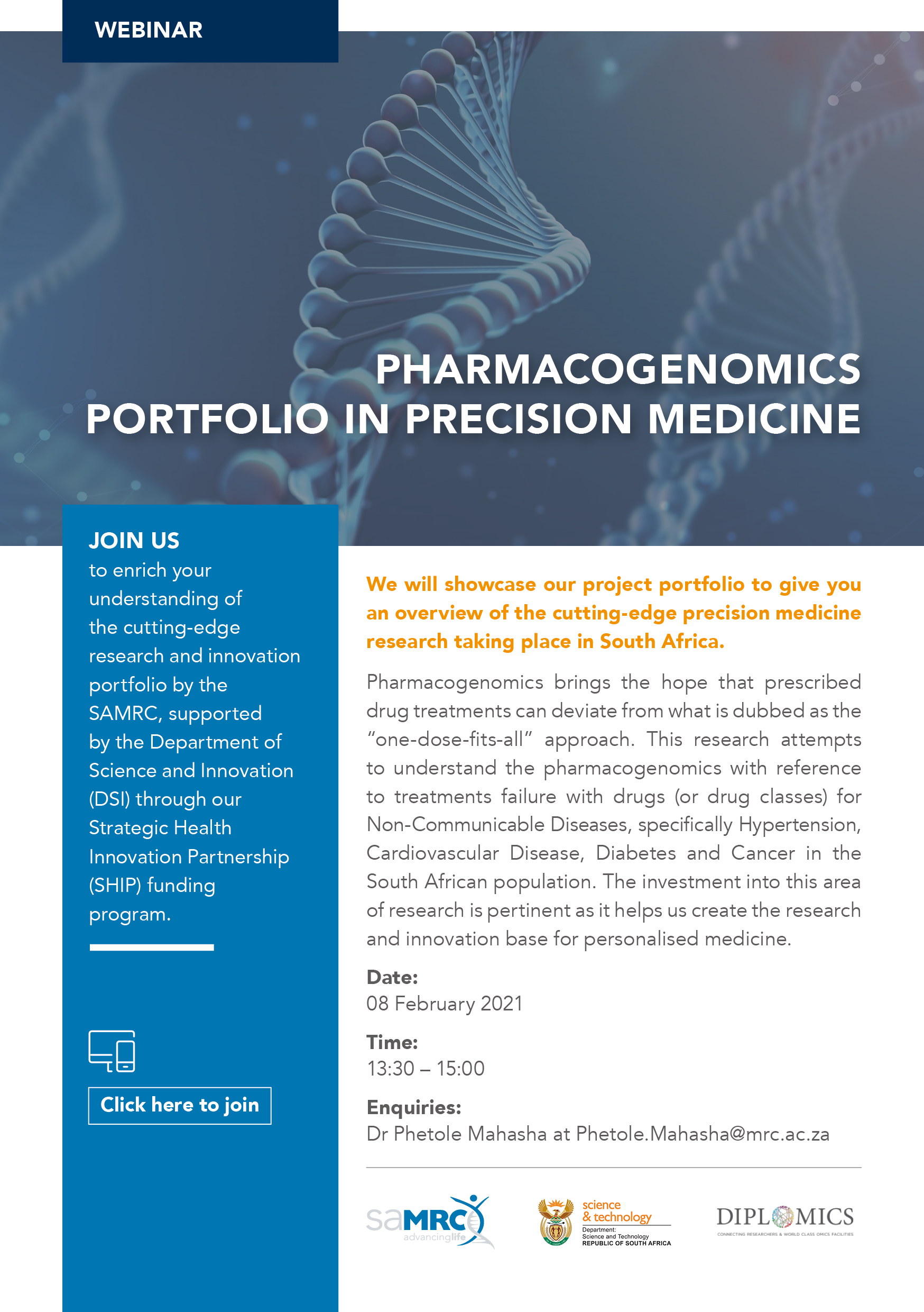 Join the Pharmacogenomics Portfolio in Precision Medicine Virtual Brief Webinar and enrich your understanding in the cutting-edge research and innovation portfolio by the SAMRC, supported by the Department of Science & Innovation through the Strategic Health Innovation Partneship (Ship) funding program.