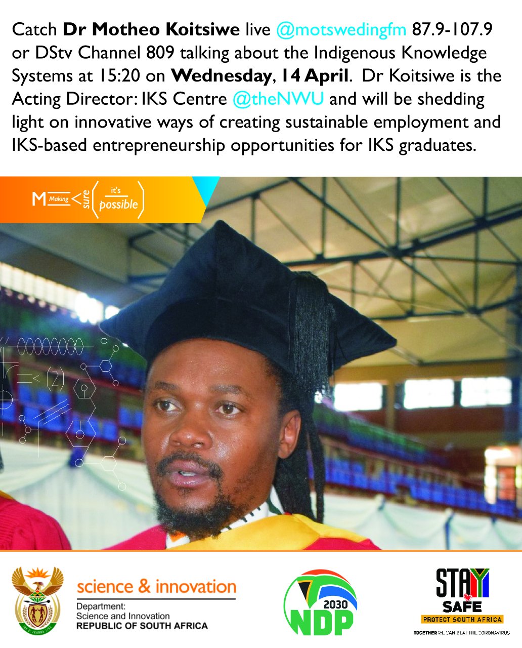 Dr Koitsiwe, the Acting Director: IKS Centre at the North West University will be shedding light on innovative ways of creating sustainable employment and IKS-based entrepreneurship opportunities for IKS graduates.